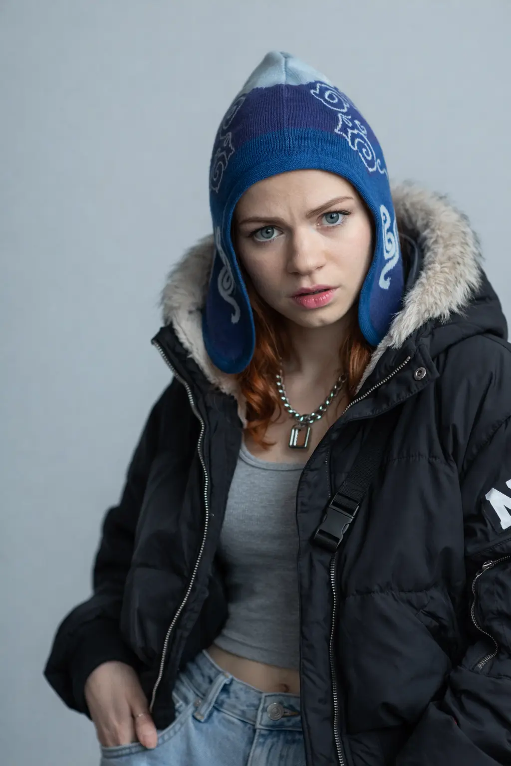 Мегри показывает, как форма ушанки может звучать современно и очень выразительно.