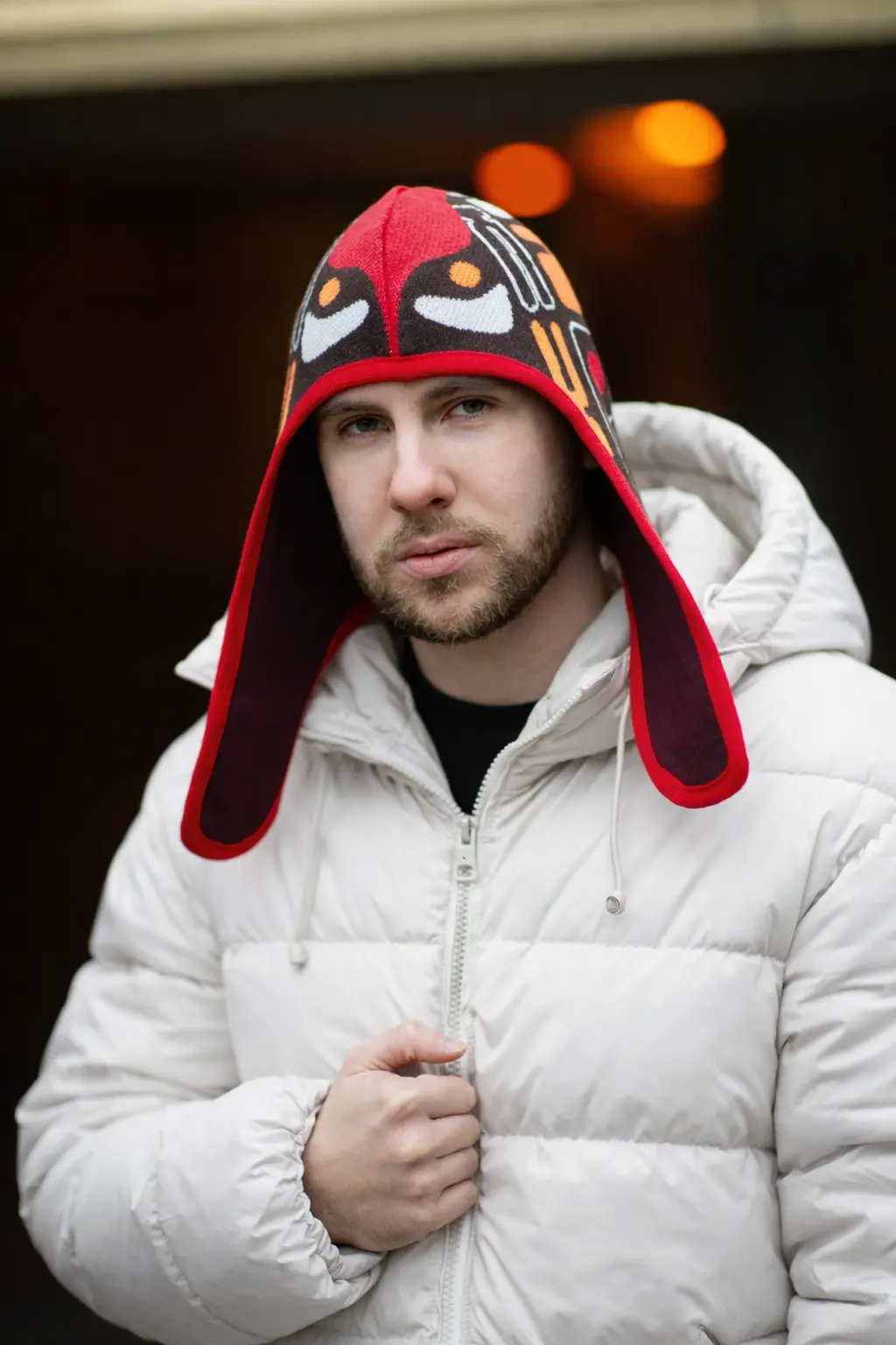 Главную роль здесь играет насыщенный красный цвет, который задаёт общий драйв аксессуара. На нём разместился мощный графический узор в чёрно-белой гамме с элементами оранжевого и алого. Цветовые акценты распределены так, что создают динамичный ритм и визуальное ощущение движения. Такое решение делает шапку ультрасовременной и энергичной.