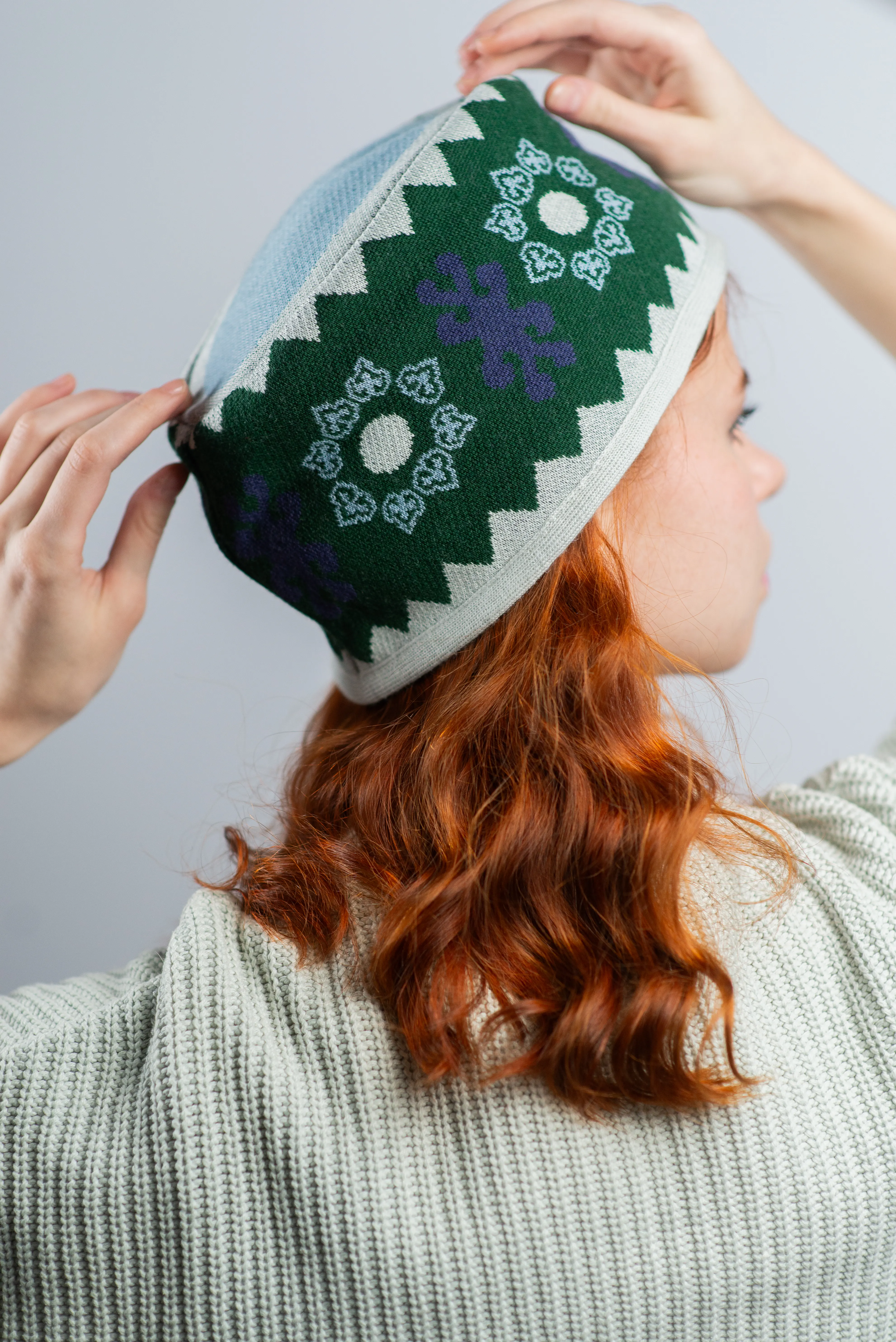 По периметру шапки проходит повторяющийся этнический узор: чередующиеся медальоны с круглыми центральными элементами в обрамлении завитков и стилизованные «древние существа» или абстрактные символы в фиолетовом цвете. Такой декор напоминает о мотивах древних войлочных ковров, резных поясов и росписи по дереву.
