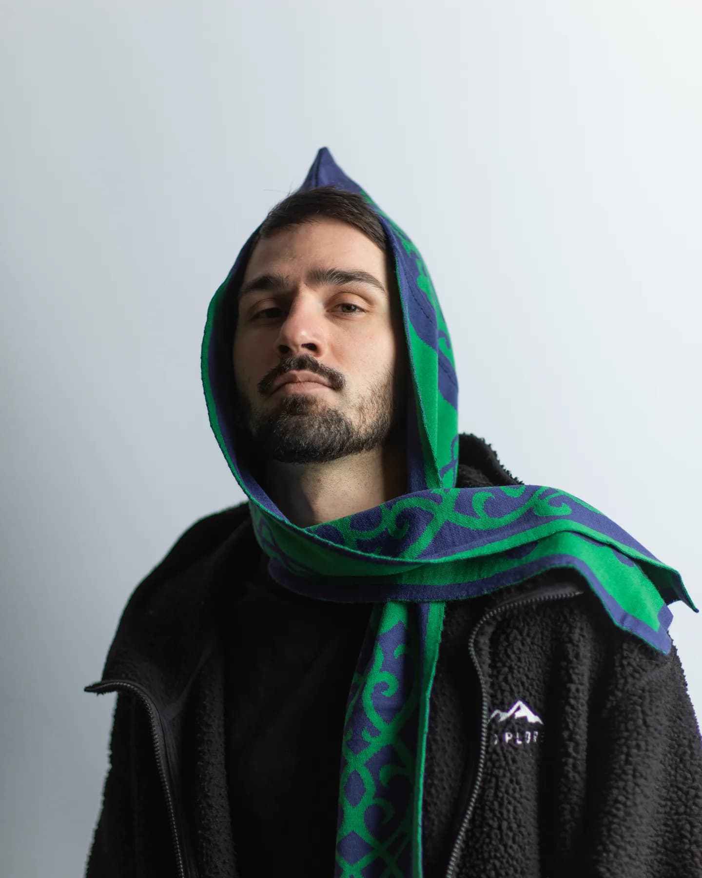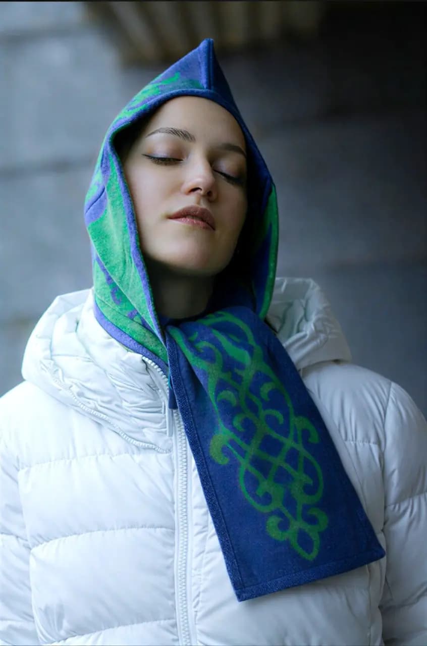 В орнаменте модели соединяются несколько смысловых пластов: река Новгородской земли как тёмная линия между слоями мира, крест в центре как четыре стороны света и точка равновесия, зелёные завитки как дыхание леса и связь с корнями, вертикали как ось между небом, человеком и землёй. Синий оттенок добавляет ощущение глубины и покоя, а зелёный поддерживает тему жизни и внутренней выносливости.