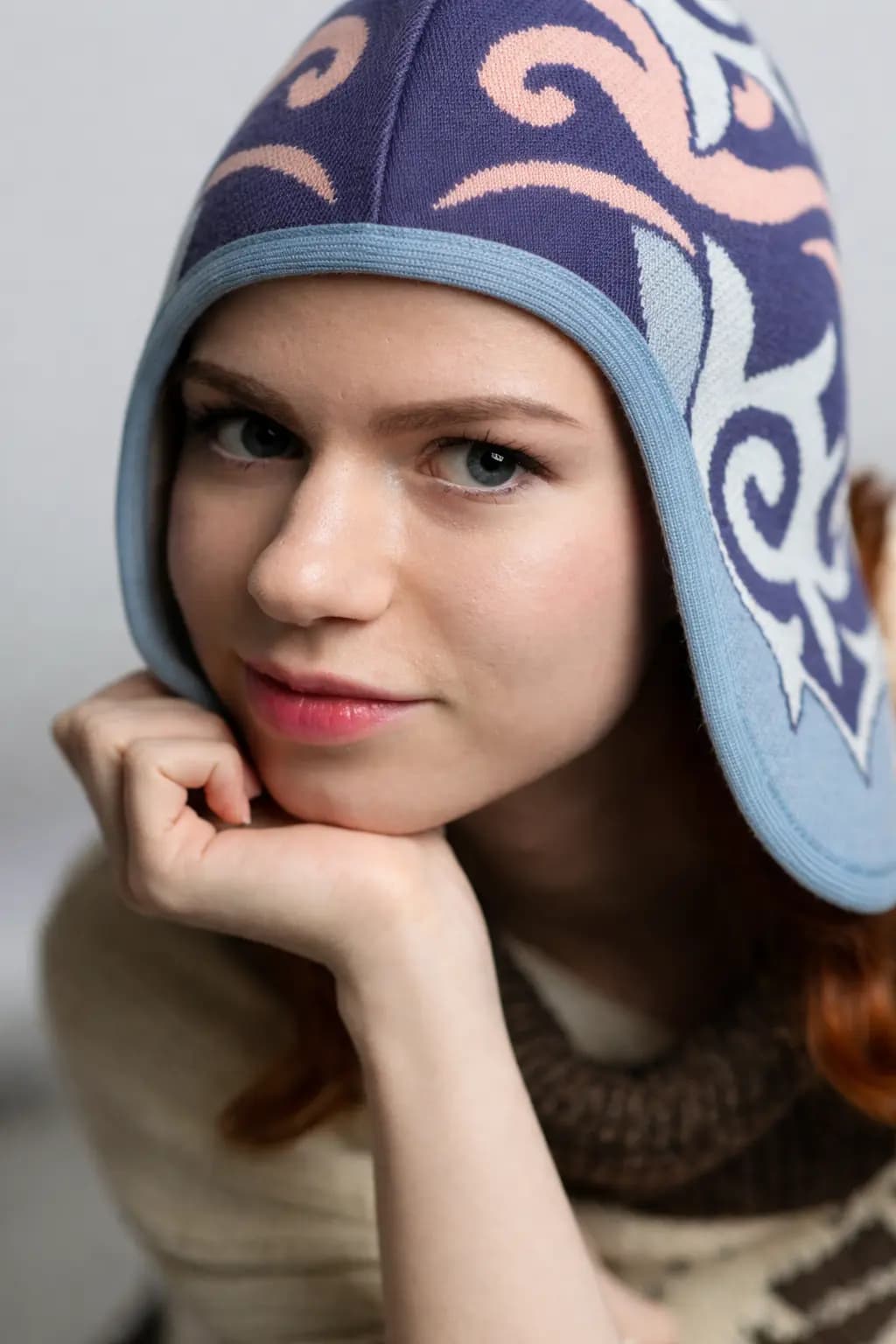 Темно-синие, голубые, бежевые и белые оттенки дают редкое сочетание глубины, ясности и спокойной световой графики. Это необычная шапка с орнаментом для тех, кто ищет дизайнерский головной убор с характером, современную этно-балаклаву и сильную форму без лишнего визуального шума.
