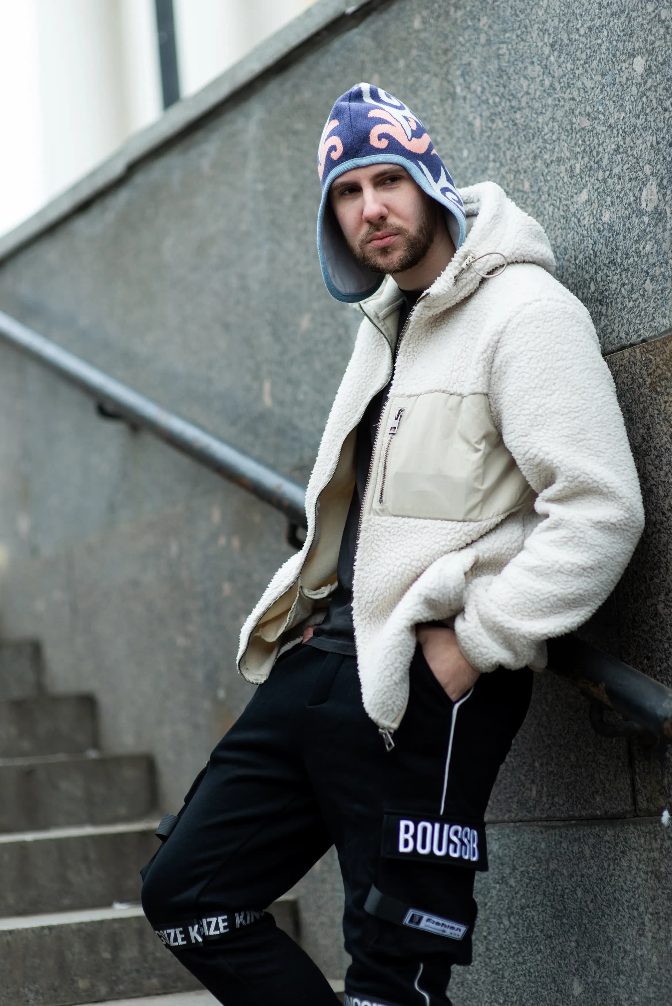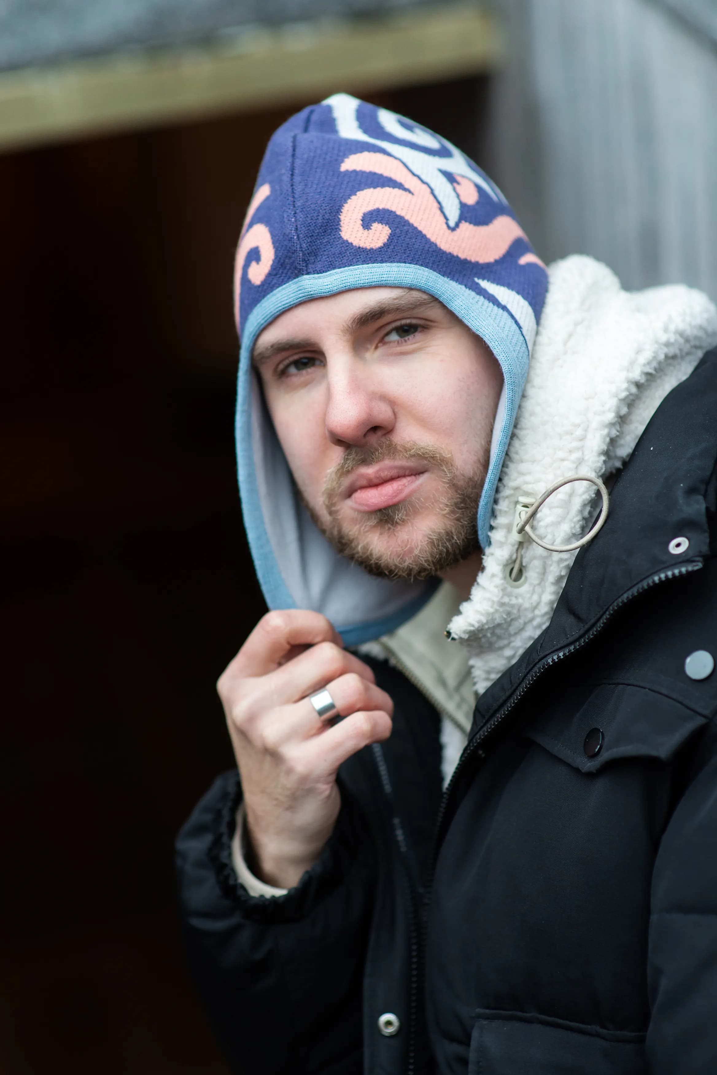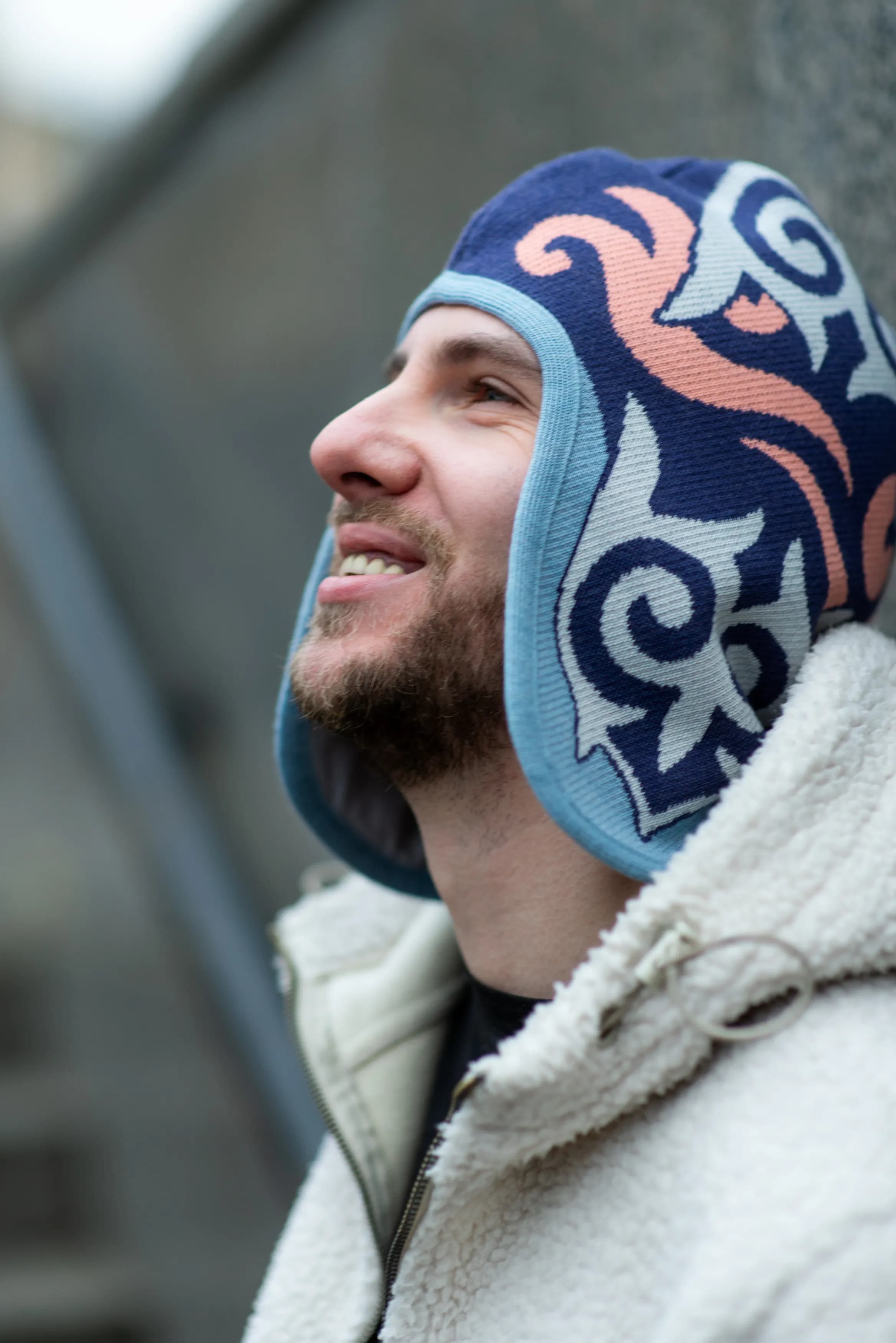 Юрюзань - дизайнерская балаклава с глубокой посадкой и формой шлема, в которой этно-минимализм получает строгую и собранную современную подачу. Темно-синий фон, голубые и бежевые акценты, светлая окантовка и чёткая симметрия создают образ вещи с сильным внутренним каркасом, рассчитанной на выразительные городские образы и осмысленный гардероб.
